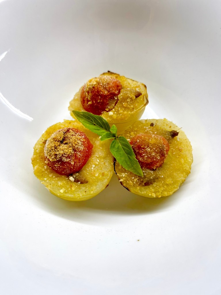 Pulire e bollire le cipolle, io ho usato le bianche, per almeno 1 ora. Passato il tempo fatele raffreddate un pochino e tagliatele a metà. Mettere un filo d’acciuga, il pachino ed il pangrattato sopra ogni mezza cipolla.
