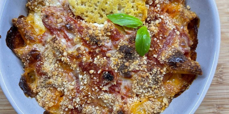 In una padella mettete un filo di olio evo, uno spicchio d’aglio ed il basilico, facciamo rosolare per 2 minuti e versiamo il pomodoro; coprite e fate cuocere per 30 minuti. Nel frattempo mettete a cuocere la pasta che dovrà essere scolata al dente in quanto proseguirà la cottura in forno. Tagliate a dadini la mozzarella e grattugiate il parmigiano. Quando sarà pronto il sugo, in una teglia condite la pasta con il sugo, la mozzarella ed il formaggio. Spolverate in superfici con pan grattato e aggiungete altro formaggio. Infornate a 180° ventilato per 15 minuti.
