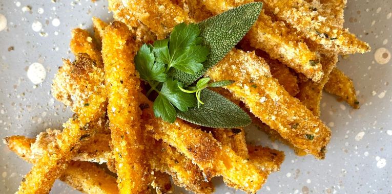 5- passate i bastoncini di zucca prima nell uovo e poi nel pangrattato e disponeteli in una teglia da forno