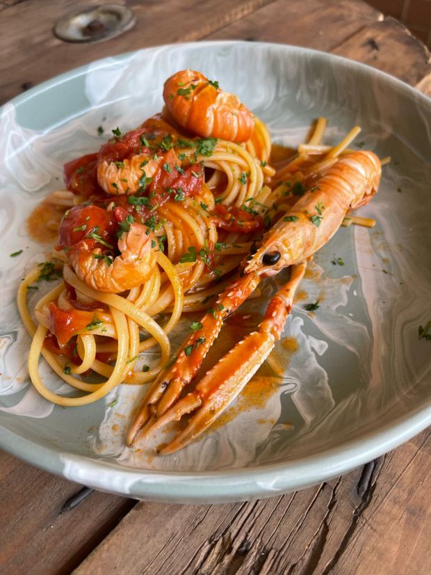✔️In un altro tegame versate olio e aglio. Aggiungete le code ed i scampi interi, sfumate con vino bianco e aggiungete poi il pomodoro. Passati 5 minuti aggiungete il fumetto e cuocete per 20 minuti.(tenetene 1 bicchiere da parte se dovesse servirvi per mantecare la pasta.)