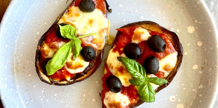 Condite le melanzane con pomodoro, olive nere e provola a piacere; per la variante vegana togliere la provola.