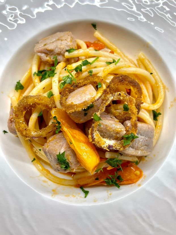 Nel frattempo tritate finemente la cipolla e aggiungete il pachino, fate cuocere con un coperchio a fuoco basso per almeno 15 minuti. Poco prima di togliere la pasta fate scottare leggermente il tonno nel pachino, e versate la pasta. Mantecate delicatamente per non rompere il tonno e impiantate a piacere.