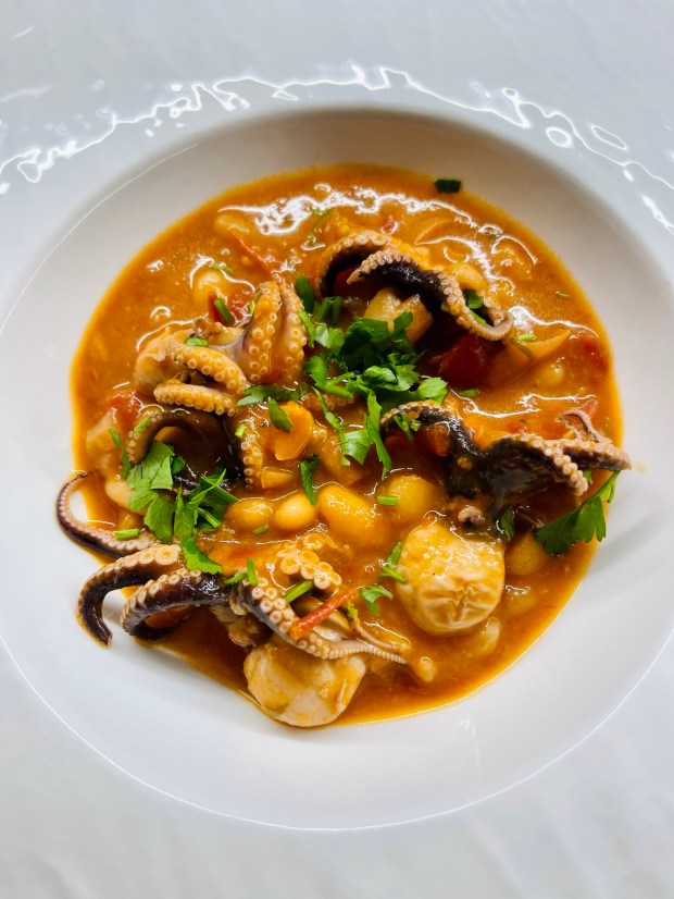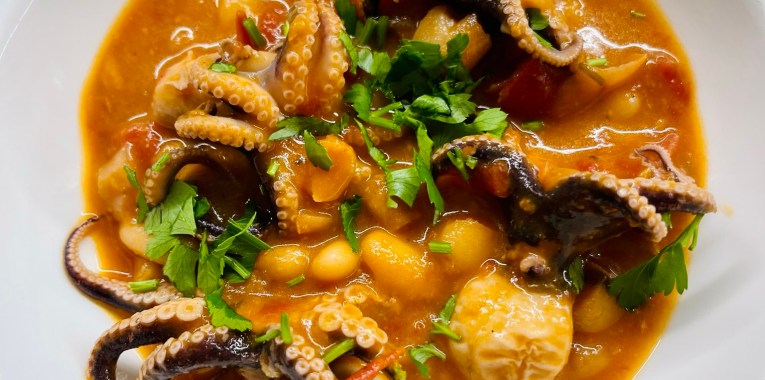 Rosolare il prezzemolo con la cipolla, aggiungere i polipetti. Dopo due minuti aggiungere i cannellini è il pomodoro @ciriocuoreitaliano , cuocere per 1 ora a fiamma bassa.