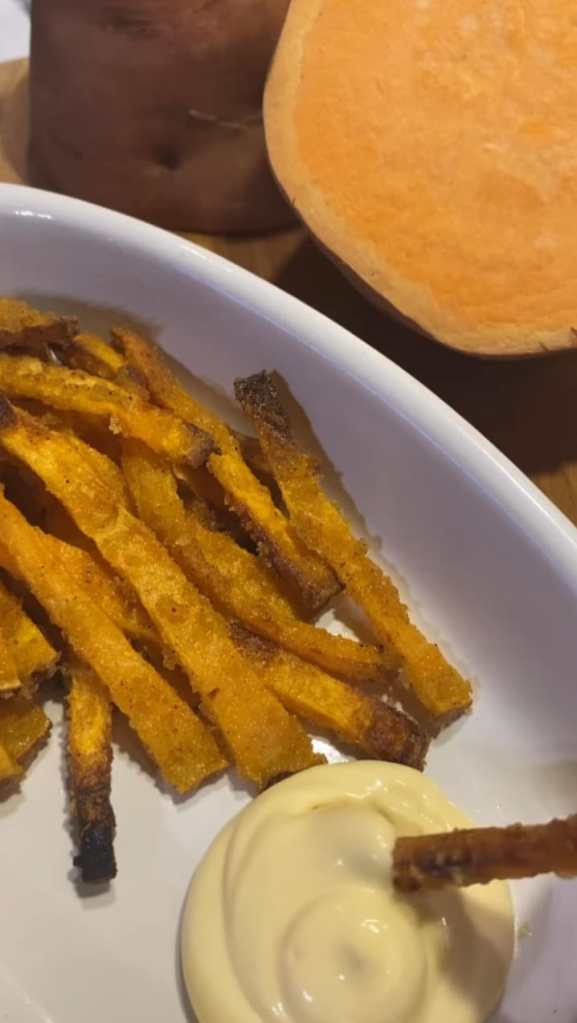 Tagliate prima a fettine le patate dolci e poi a tocchetti. Aggiungete dentro una ciotola tutti gli ingredienti e amalgamate le patate con un cucchiaio. Trasferite in una teglia da forno e infornate a 200 gradi per circa 15 minuti modalità ventilato.