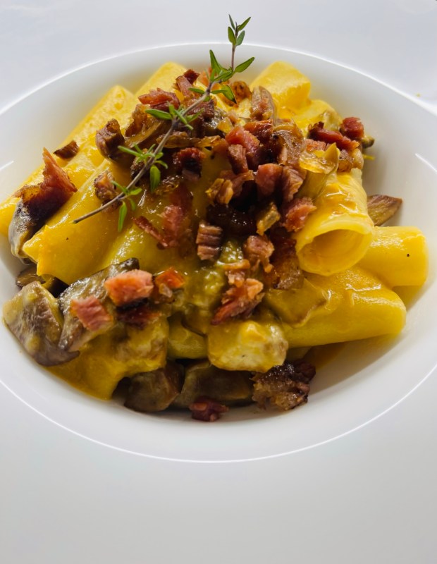Aggiungere la pasta e mantecare con la panna.