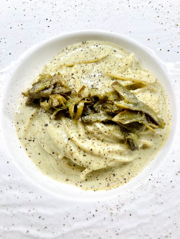 Lasciate a bagno in acqua e limone i carciofi. Tagliateli a fettine e ripassateli in padella con un filo di olio evo, mentuccia e 2 bicchieri di acqua. A cottura ultimata (circa 40 minuti) frullateli insieme alla stracciatella. Ottenuta la crema, aggiungetela alla pasta, se occorre aggiungere 1 bicchiere di acqua di cottura.