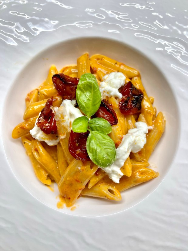 Ci vuole veramente poco. Un primo piatto pronto in pochissimi minuti. Fate rosolare l’aglio con l’ olio evo. Aggiungiamo il datterino e fate cuocere per almeno 20 minuti a fuoco medio alto, se riuscite a farli leggermente “abbrustoliti” daranno un sapore unico al piatto. Una volta pronti, frullate i datterini, 3/4 di burrata con un filo di olio. Lasceremo qualche pachino da parte per la guarnizione finale. Quando la pasta sarà cotta riparatela in padella con il composto frullato e mantecate. IL PIATTO È PRONTO.