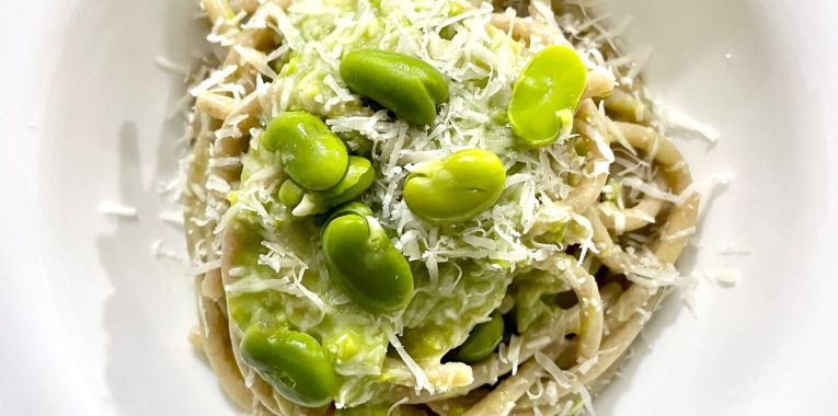 • sgranate le fave e bollitele in acqua per almeno 20 minuti • una volta raffreddate togliete la buccia • unite un filo di olio evo e sale • schiacciate con una forchetta o frullate con un mixer • cuocete la pasta • scolare la pasta in una pentola insieme alla crema di fave • ripassare qualche minuto in padella con 130 g di pecorino e mezzo bicchiere di acqua di cottura • impiantate e aggiungete altro pecorino con qualche fava avanzata