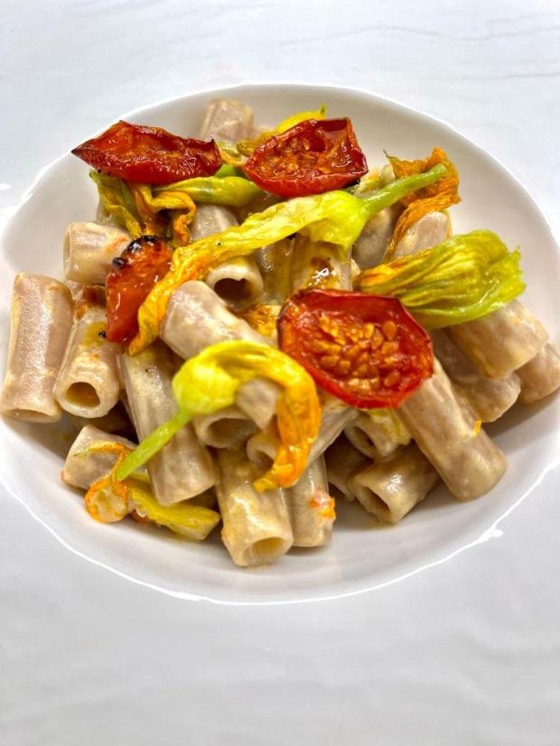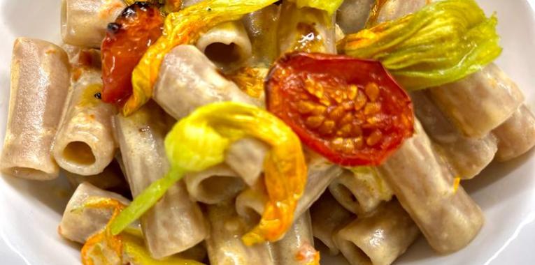 Per prima cosa pulire i fiori di zucca privandoli delle punte e del pistillo; rosolateli quindi in padella per 3 minuti con un filo d’olio. Tagliate poi i datterini in due, posizionateli su una teglia e spargete sopra lo zucchero. Infornate a 170 gradi ventilato per 20/30 minuti. Saranno pronti quando avranno tolto gran parte del liquido. Una volta pronti frullateli insieme alla stracciatella, lasciandone da parte qualcuno per L’impiattamento. Scolate la pasta e aggiungete il composto frullato.