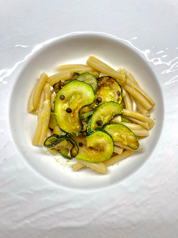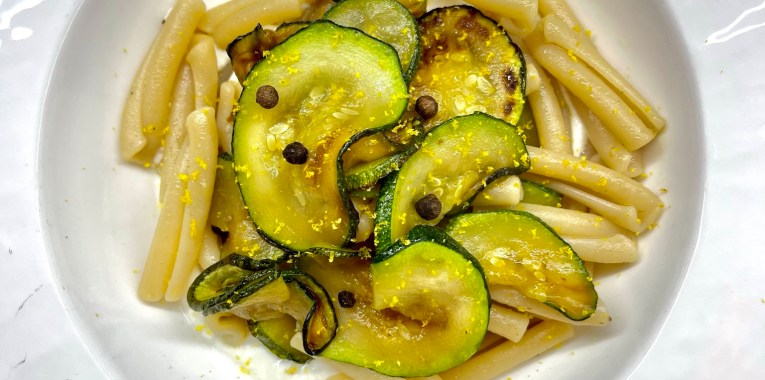 Tagliate le zucchine a fettine e rosolatele in padella con un filo d’olio e la scorza di mezzo limone. In acqua bollente e salata mettete la pasta e nel frattempo che cuoce in un pentolino unite la panna liquida con la ricotta a fuoco basso e fate sciogliere. Scolate la pasta nelle zucchine e ripassate leggermente le Caserecce aiutandovi con mezzo bicchiere di acqua di cottura. In un piatto fondo mettete prima la ricotta e sopra la pasta. Consigliatissima una spolverata di scorza di limone 🍋.