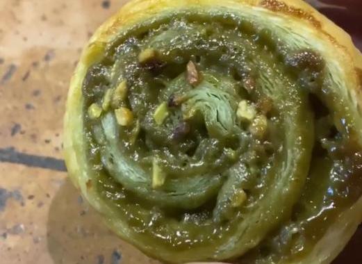 Stendere il foglio di pasta sfoglia, spalmare la crema al pistacchio e girare la pasta sfoglia. Tagliarla a fette spesse di circa 3cm e trasferirle sulla teglia da forno.