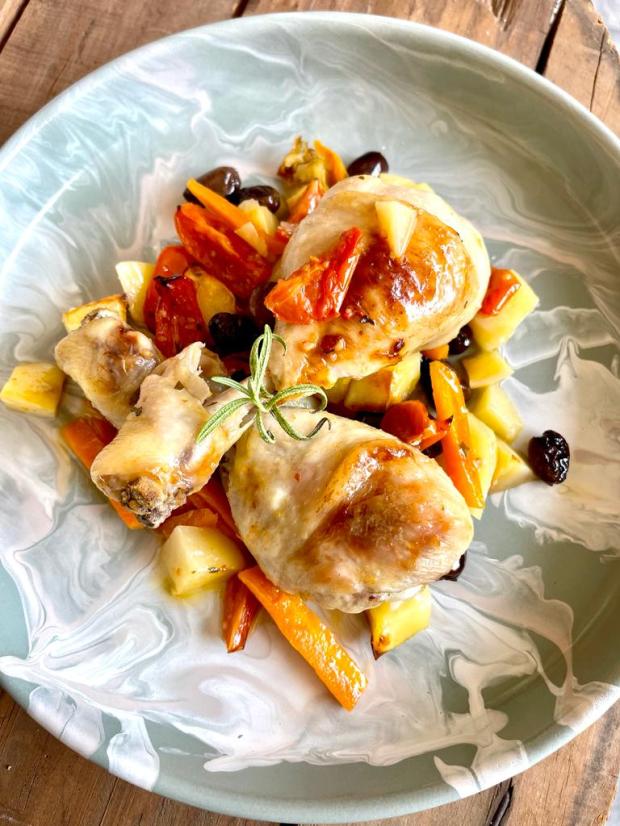 Basta tagliare a tocchetti tutte le verdure, ed adagiarle in una teglia capiente insieme alle cosce di pollo 🍗 e al vino.